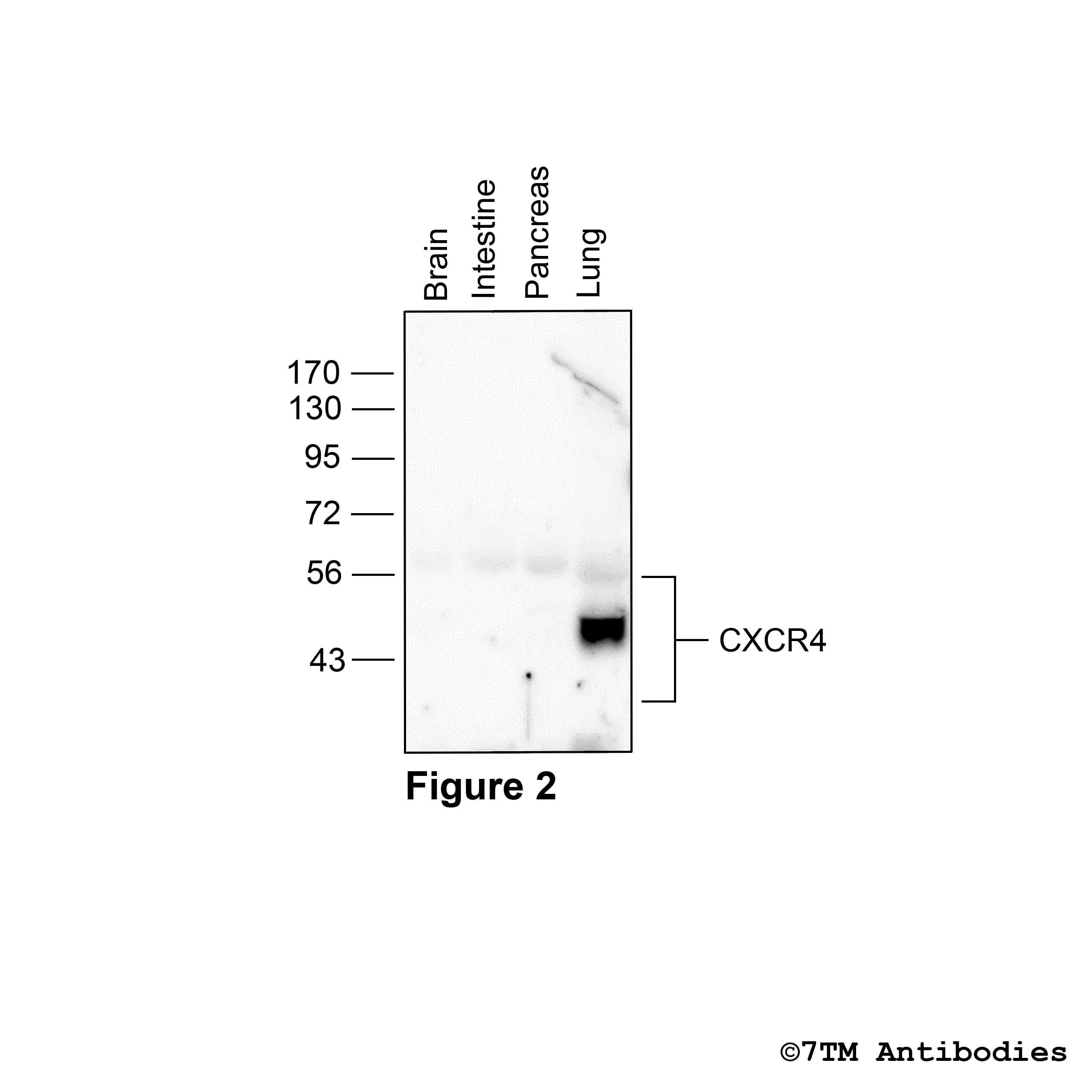 Figure 2. Indentification of CXC Chemokine Receptor 4 in mouse tissues. Native mouse tissues were lysed and GPCR receptors were enriched by using WGA-beads (see 7TM Western Blot Protocol). Extracted proteins were immunoblotted with the phosphorylation-independent anti-CXCR4 antibody (7TM071N-GP) at a dilution of 1:1000.