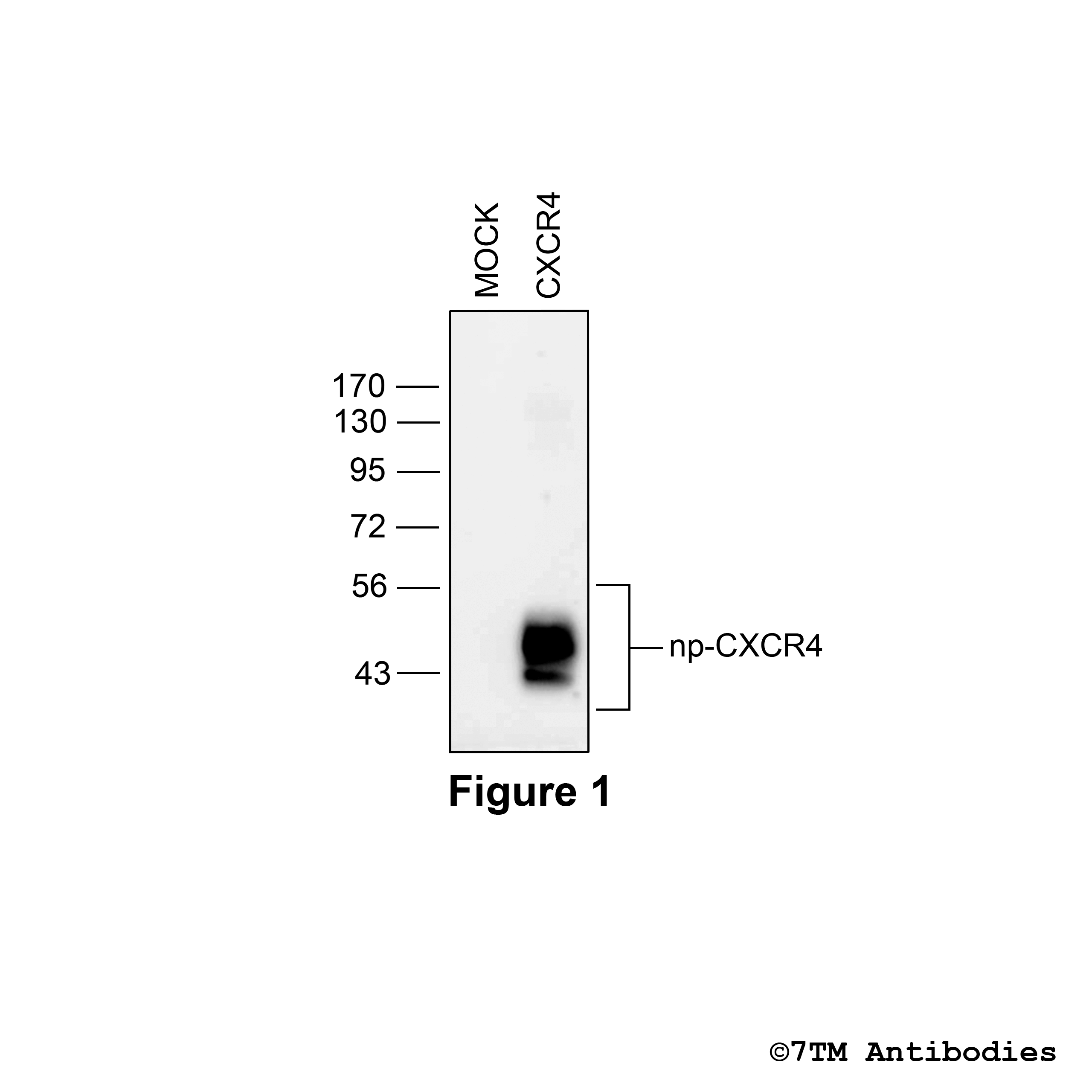 Figure 1. Validation of the CXC Chemokine Receptor 4 in transfected HEK293 cells. Native HEK293 cells (MOCK) or HEK293 cells stably expressing the CXC Chemokine Receptor 4 (CXCR4) were lysed and immunoblotted with the phosphorylation-sensitive anti-CXCR4 antibody (7TM0071N-GP) at a dilution of 1:1000.