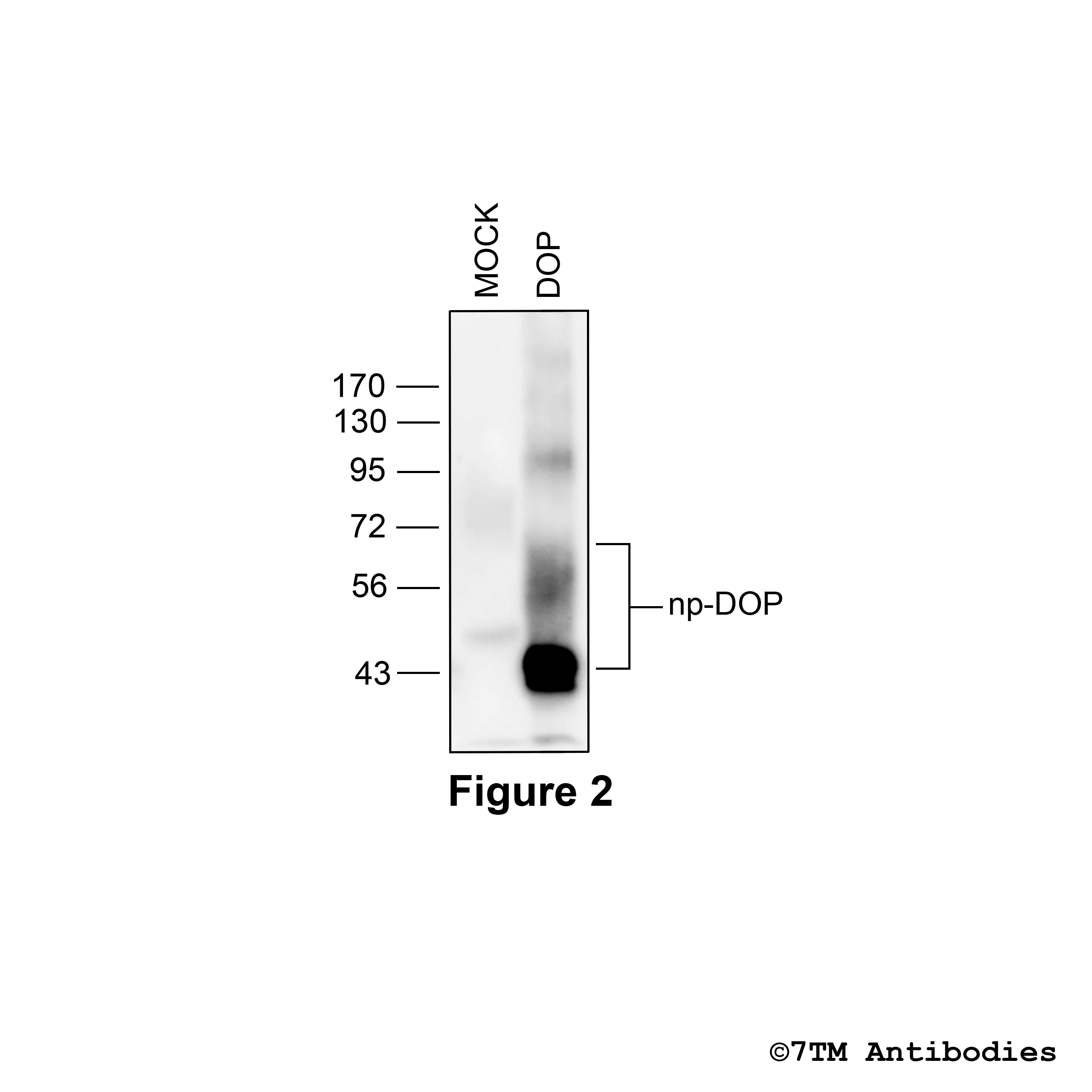 Figure 1. Validation of the δ-Opioid Receptor in transfected HEK293 cells. Native HEK293 cells (MOCK) or HEK293 cells stably expressing the δ-Opioid Receptor (DOP) were lysed and immunoblotted with the phosphorylation-independent anti-DOP antibody (7TM0317N-GP) at a dilution of 1:1000.