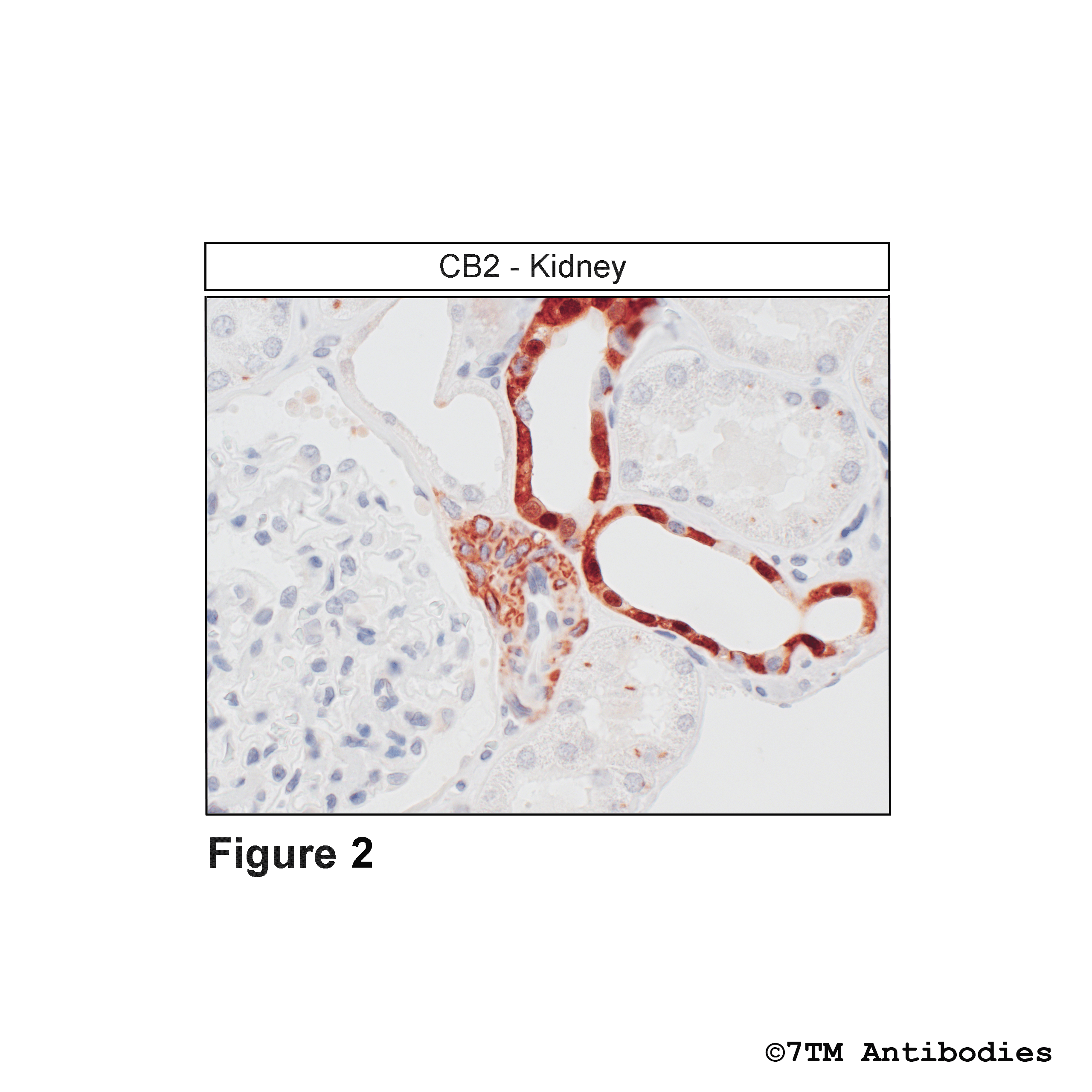 Figure 2. Immunohistochemical identification of the Cannabinoid Receptor 2 in kidney. Sections were dewaxed, microwaved in citric acid, and incubated with anti-CB2 (Cannabinoid Receptor 2) antibody (7TM0057N) at a dilution of 1:100. Sections were then sequentially treated with biotinylated anti-rabbit IgG and avidin-biotin solution.Color was developed by incubation in 3-amino-9-ethylcarbazole (AEC), and sections were counterstained with hematoxylin.