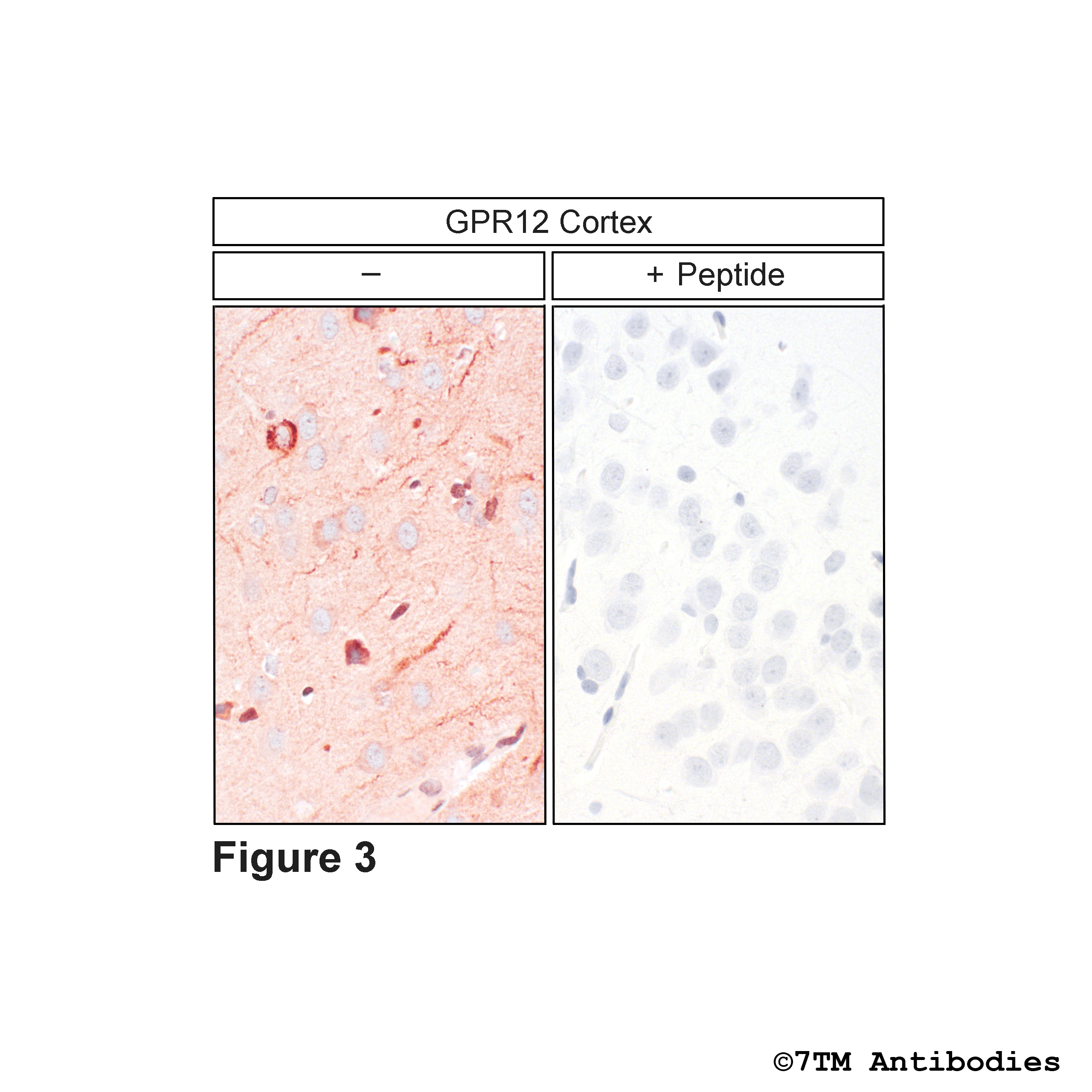 The GPR12 antibody is directed against the distal end of the carboxyl-terminal tail of mouse, rat and human GRP12. It can be used to detect total GPR12 receptors in Western blots independent of phosphorylation. The GPR12 antibody can also be used to isolate and enrich GPR12 receptors from brain lysates. It also detects GPR12 in cultured cells and tissue sections by immunohistochemistry.