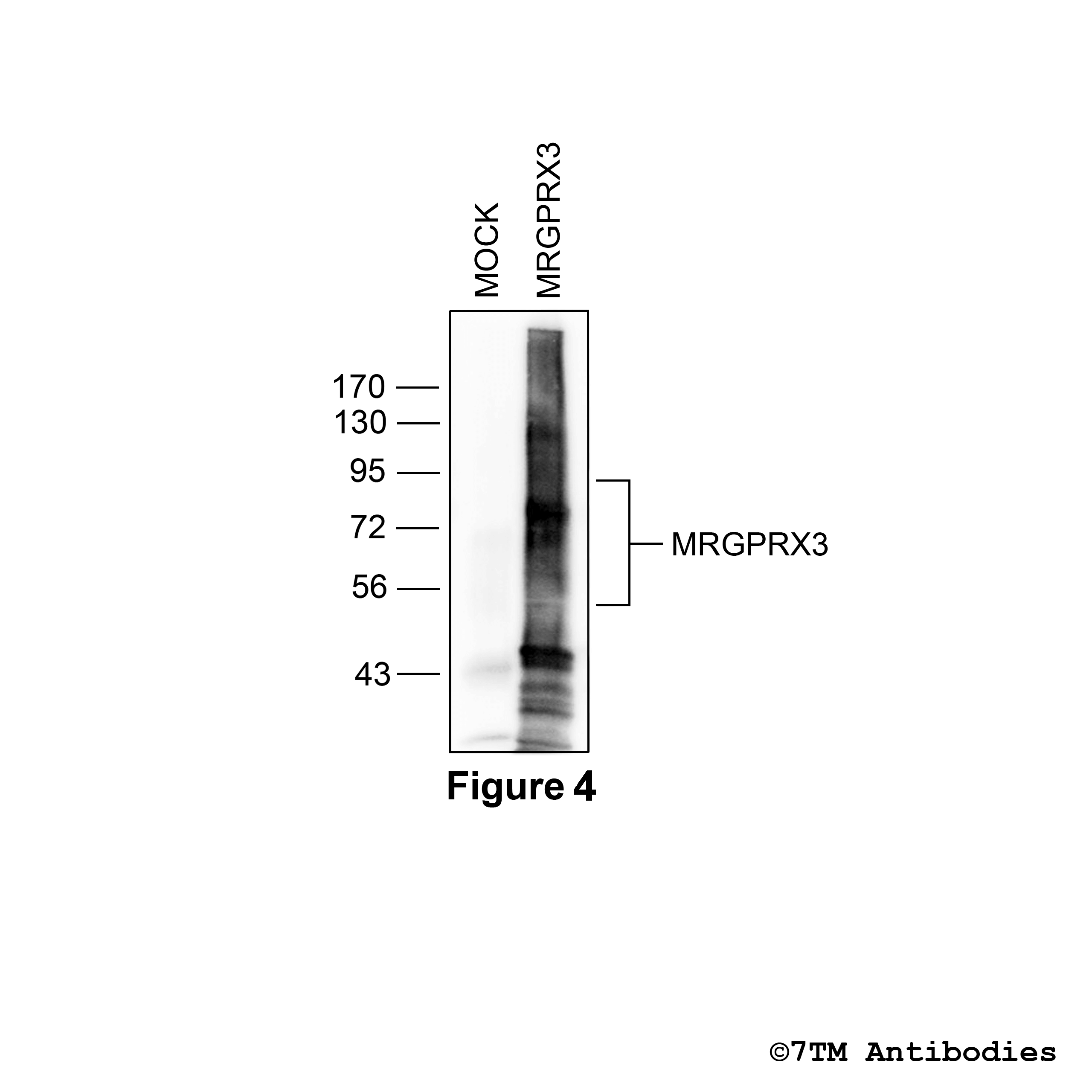 Figure 4. Validation of the MRGPRX3 Receptor in transfected HEK293 cells. Native HEK293 cells (MOCK) or HEK293 cells stably expressing the MRGPRX3 Receptor (MRGPRX3) were lysed and immunoblotted with the phosphorylation-independent anti-MRGPRX3 antibody (7TM0158N) at a dilution of 1:1000.