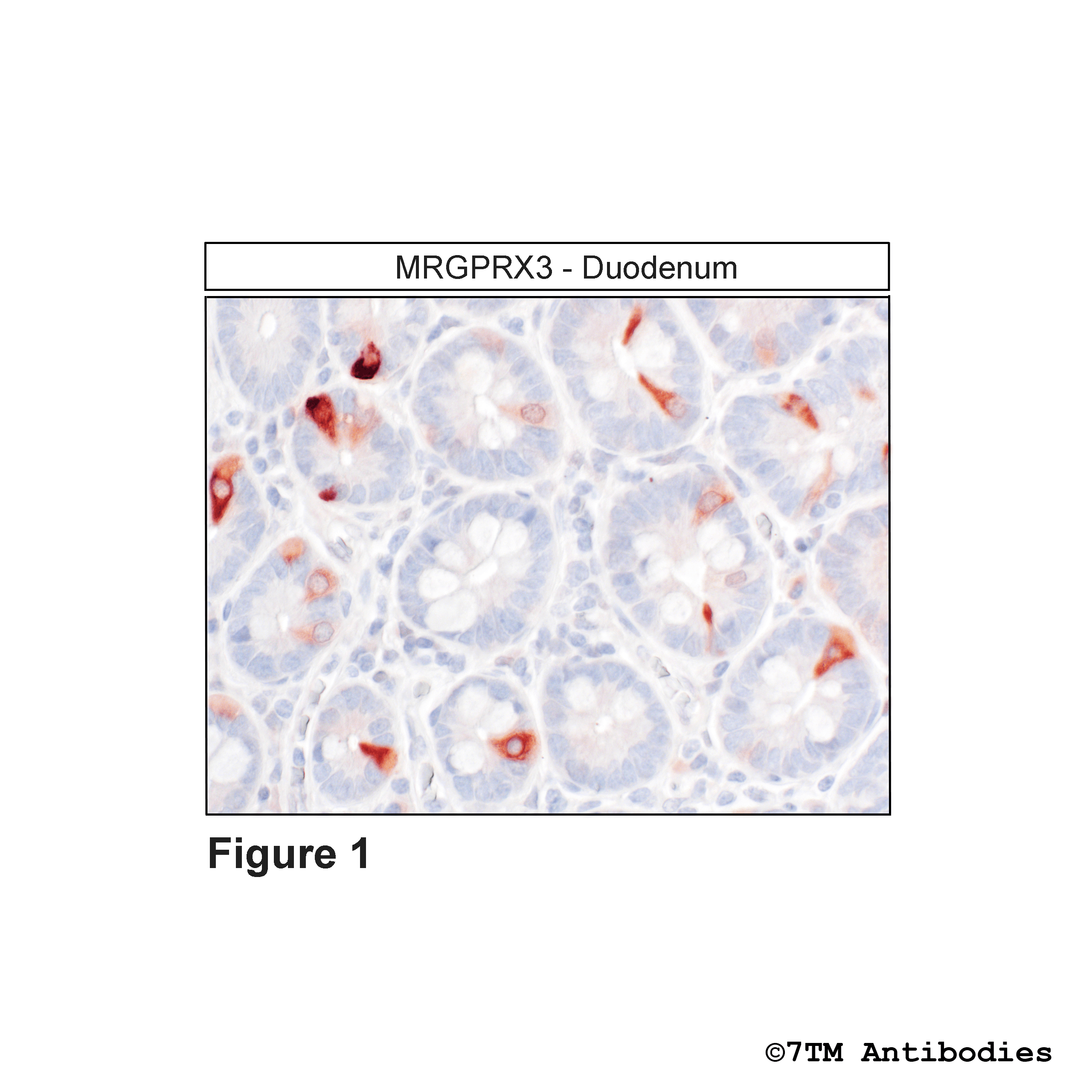 Figure 1. Immunohistochemical identification of MRGPRX3 Receptor in dudenum. Sections were dewaxed, microwaved in citric acid, and incubated with anti-MRGPRX3 (MRGPRX3 Receptor) antibody (7TM0158N) at a dilution of 1:100. Sections were then sequentially treated with biotinylated anti-rabbit IgG and avidin-biotin solution.Color was developed by incubation in 3-amino-9-ethylcarbazole (AEC), and sections were counterstained with hematoxylin.