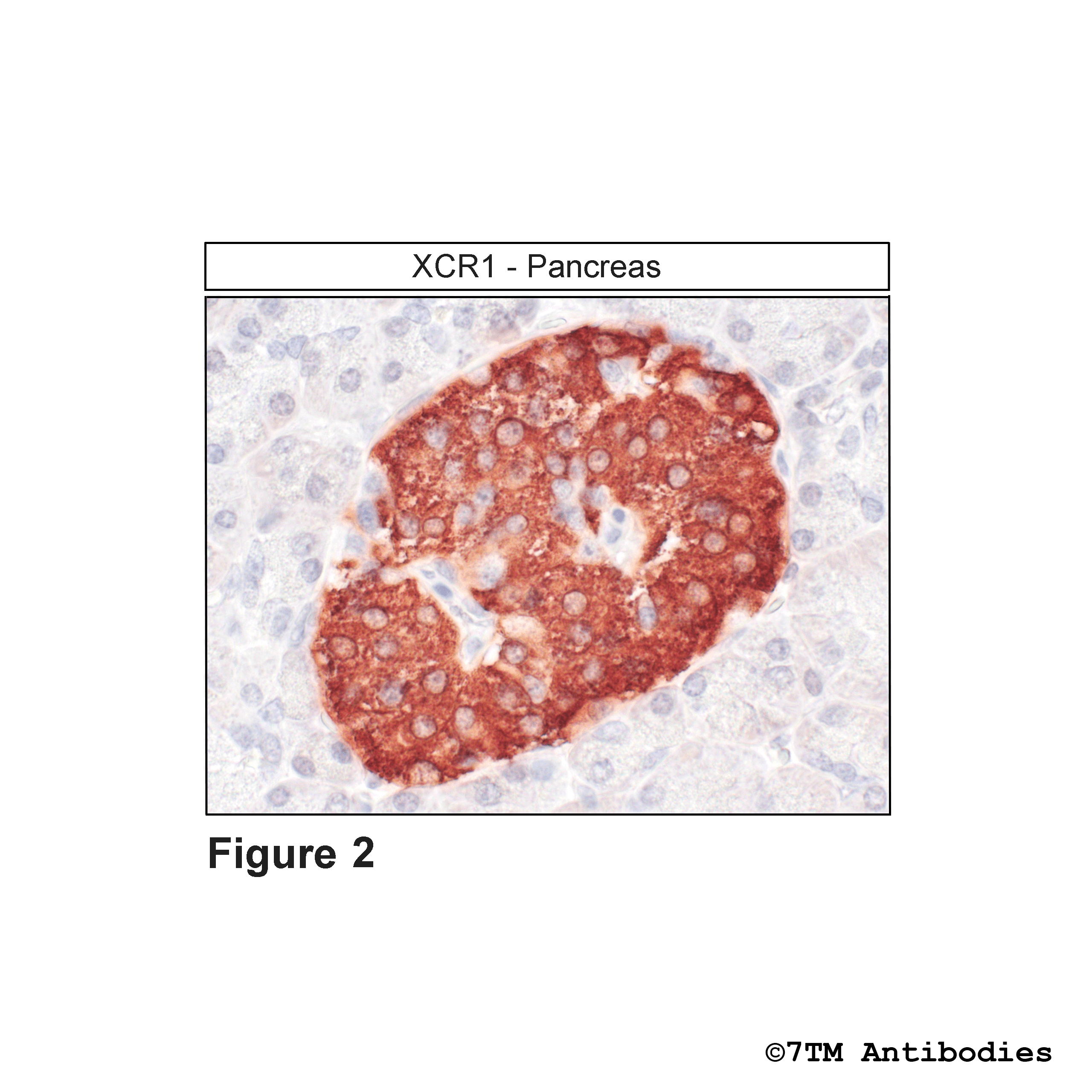 The non-phospho-XCR1 receptor antibody is directed against the distal part of the carboxyl-terminal tail of human XCR1. It can be used to detect total XCR1 receptors in Western blots independent of phosphorylation. The non-phospho-XCR1 antibody can also be used to isolate and enrich XCR1 receptors from cell and tissue lysates.  It also detects XCR1 in cultured cells and tissue sections by immunohistochemistry.