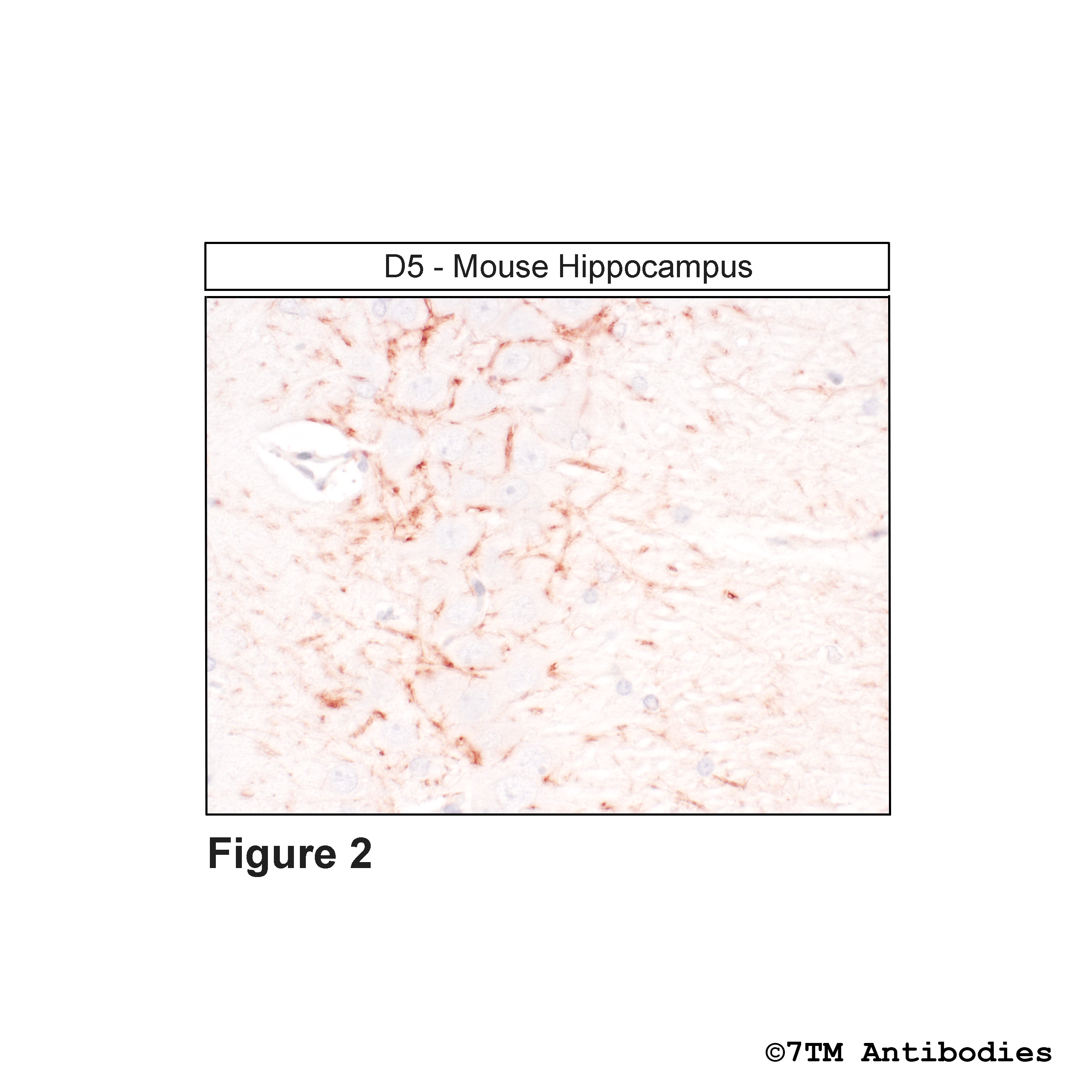 Figure 2. Immunohistochemical identification of Dopamine Receptor 5 in mouse hippocampus. Sections were dewaxed, microwaved in citric acid, and incubated with anti-D5 (Dopamine Receptor 5) antibody (7TM0218N-IC) at a dilution of 1:100. Sections were then sequentially treated with biotinylated anti-rabbit IgG and avidin-biotin solution. Sections were then developed in 3,3-diaminobenzidine (DAB)-glucose oxidase and lightly counterstained with hematoxylin.
