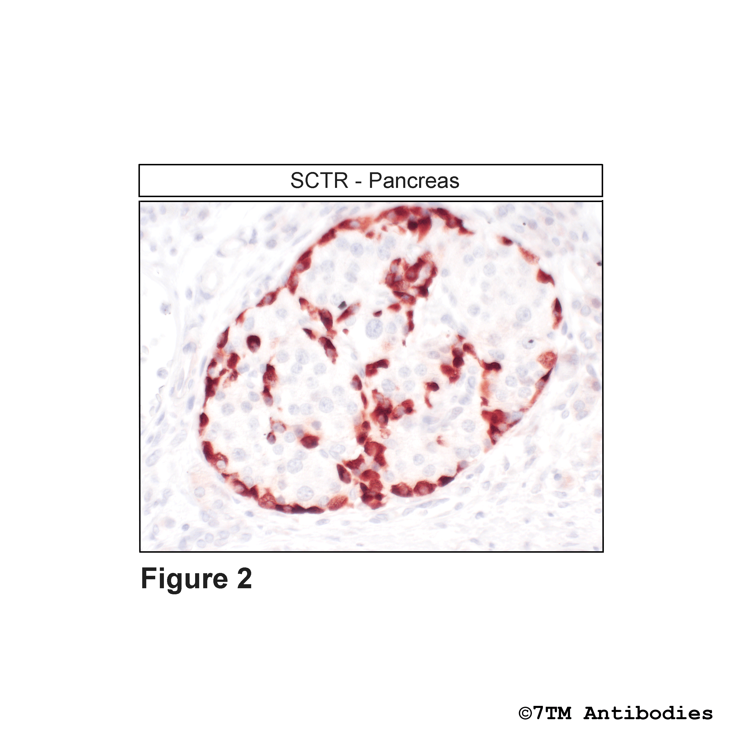 Figure 2. Immunohistochemical identification of Secretin Receptor in pancreas. Sections were dewaxed, microwaved in citric acid, and incubated with anti-SCTR (non-phospho-Secretin Receptor) antibody (7TM0252N-IC) at a dilution of 1:100. Sections were then sequentially treated with biotinylated anti-rabbit IgG and avidin-biotin solution. Color was developed by incubation in 3-amino-9-ethylcarbazole (AEC), and sections were counterstained with hematoxylin.