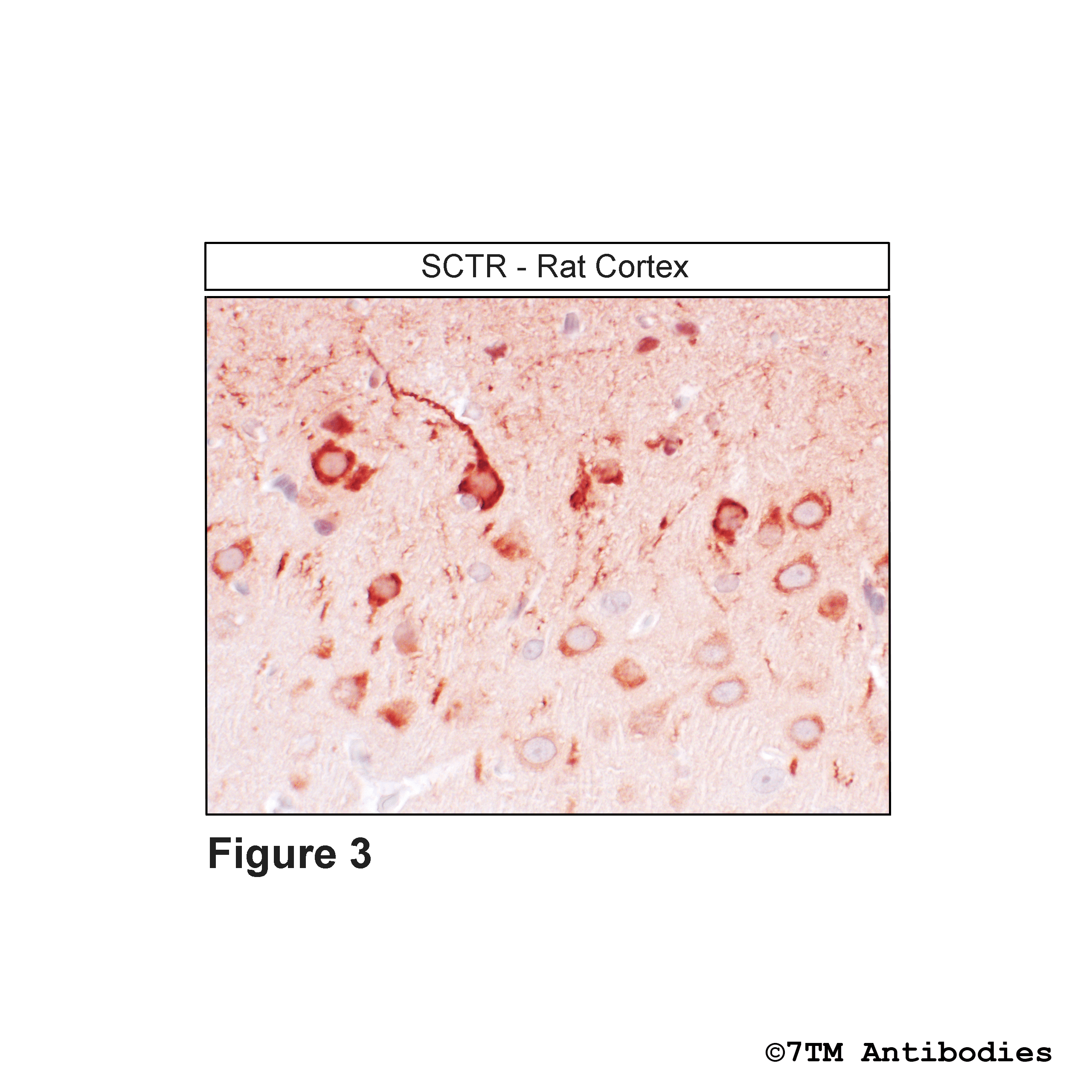 Figure 3. Immunohistochemical identification of Secretin Receptor in rat cortex. Sections were dewaxed, microwaved in citric acid, and incubated with anti-SCTR (non-phospho-Secretin Receptor) antibody (7TM0252N-IC) at a dilution of 1:100. Sections were then sequentially treated with biotinylated anti-rabbit IgG and avidin-biotin solution. Color was developed by incubation in 3-amino-9-ethylcarbazole (AEC), and sections were counterstained with hematoxylin.