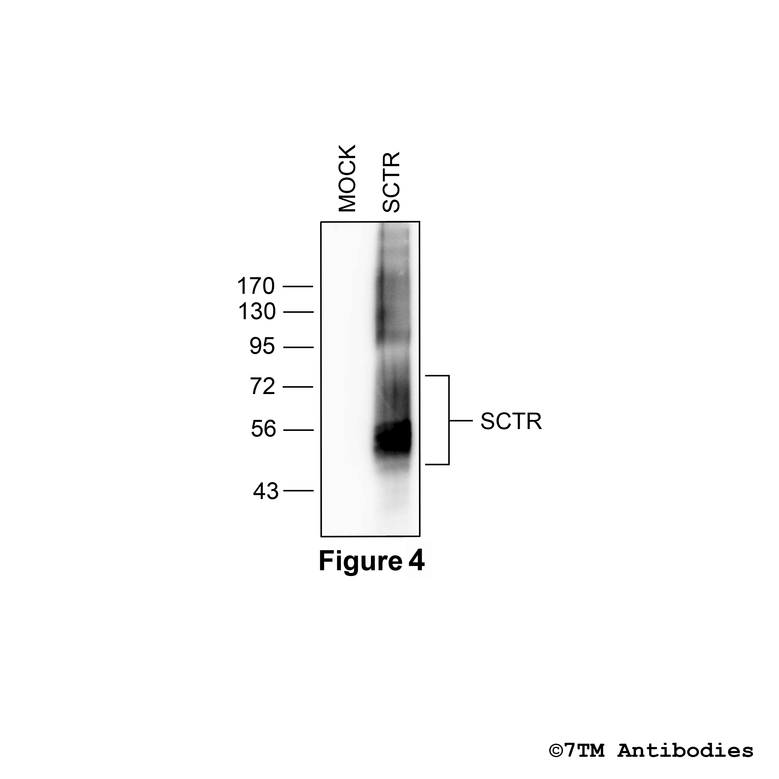 Figure 4. Validation of the Secretin Receptor in transfected HEK293 cells. Native HEK293 cells (MOCK) or HEK293 cells stably expressing the Secretin Receptor (SCTR) were lysed and immunoblotted with the phosphorylation-independent anti-SCTR antibody (7TM0252N-IC) at a dilution of 1:100.