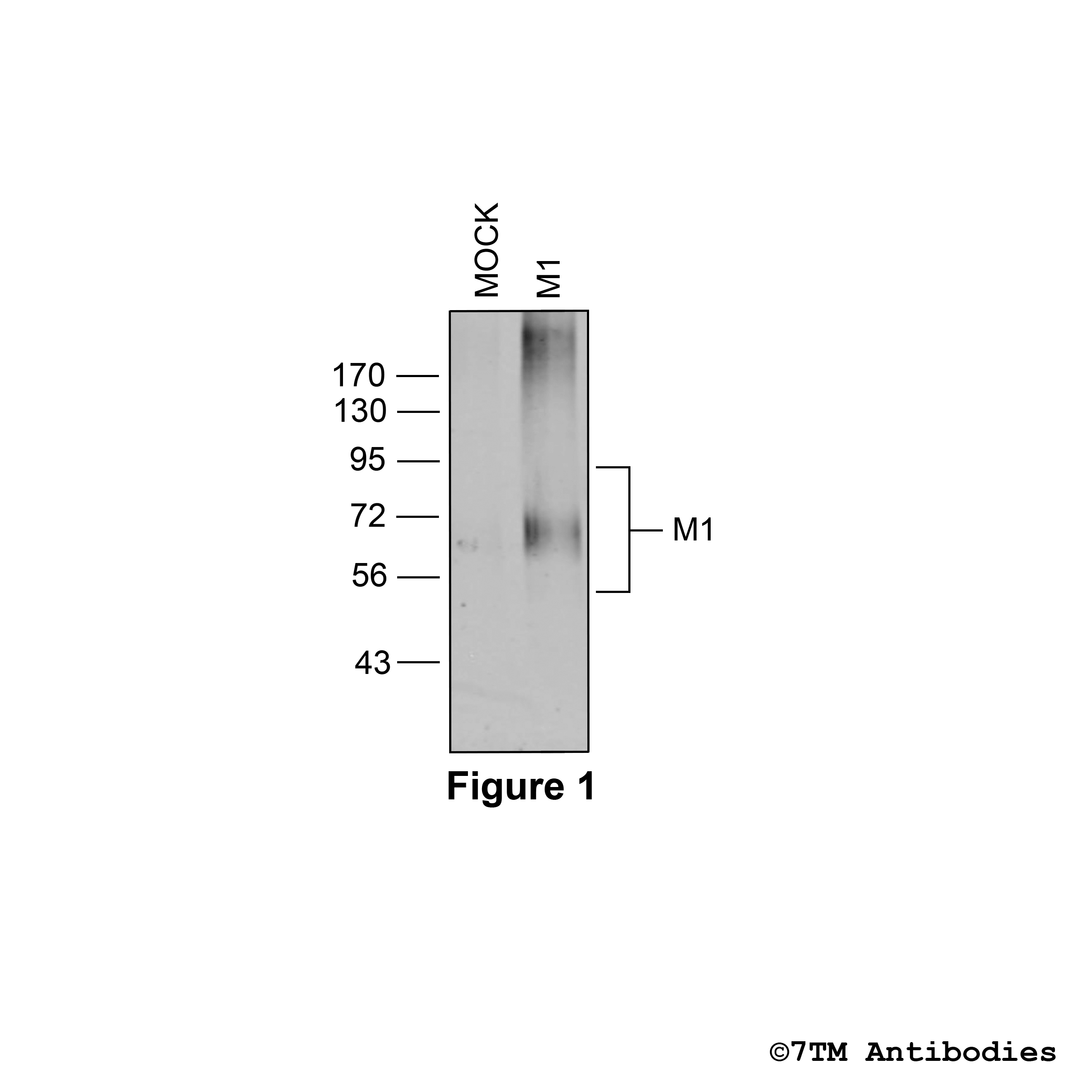 Figure 1. Validation of the M1 Muscarinic Acetylcholine Receptor in transfected HEK293 cells. Native HEK293 cells (MOCK) or HEK293 cells stably expressing the M1 Muscarinic Acetylcholine Receptor (M1) were lysed and immunoblotted with the phosphorylation-independent anti-M1 antibody (7TM0013N) at a dilution of 1:1000.