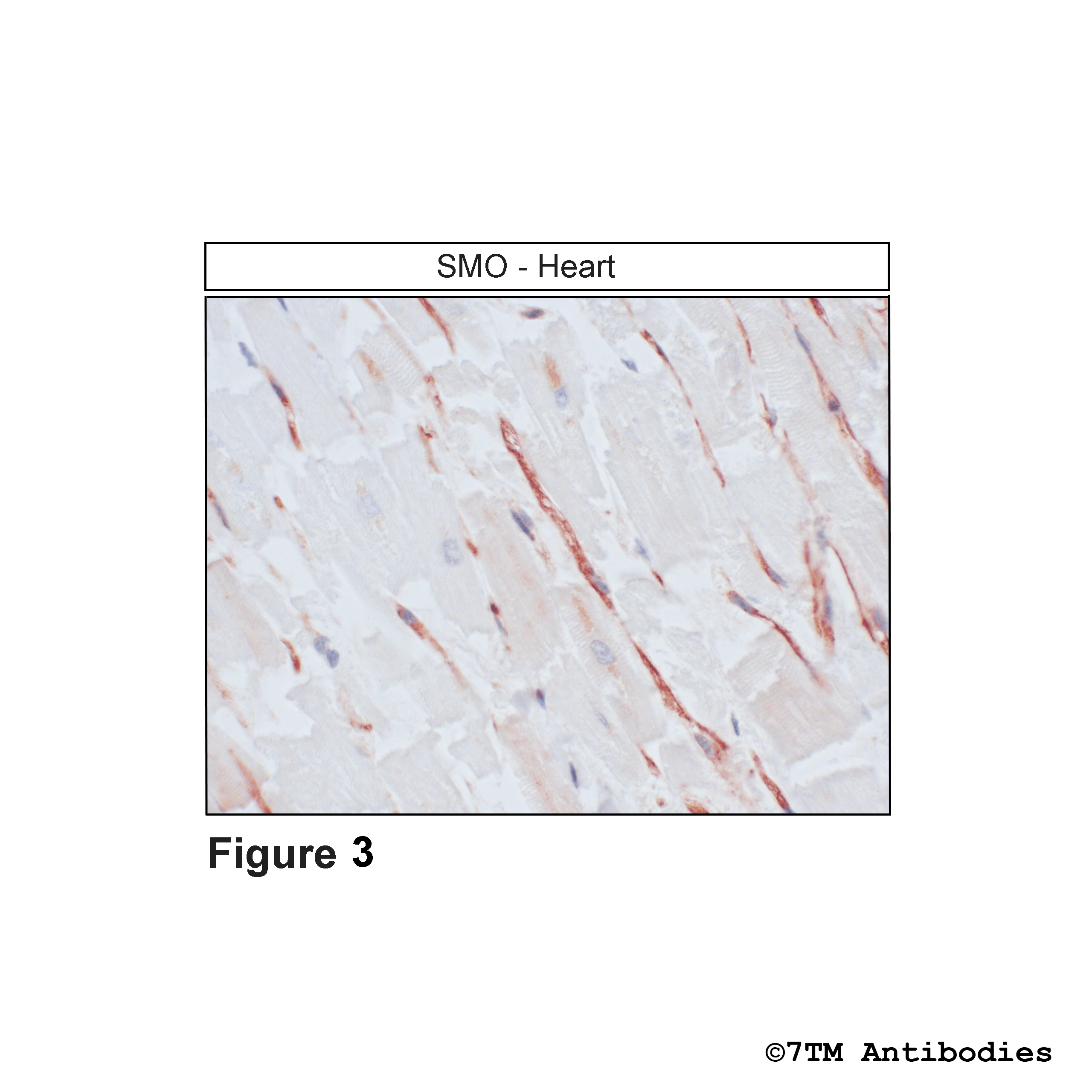 Figure 3. Immunohistochemical identification of Smoothened Receptor in heart. Sections were dewaxed, microwaved in citric acid, and incubated with anti-SMO (non-phospho-Smoothened Receptor 1) antibody (7TM0239N-GP) at a dilution of 1:100. Sections were then sequentially treated with biotinylated anti-rabbit IgG and avidin-biotin solution. Color was developed by incubation in 3-amino-9-ethylcarbazole (AEC), and sections were counterstained with hematoxylin.