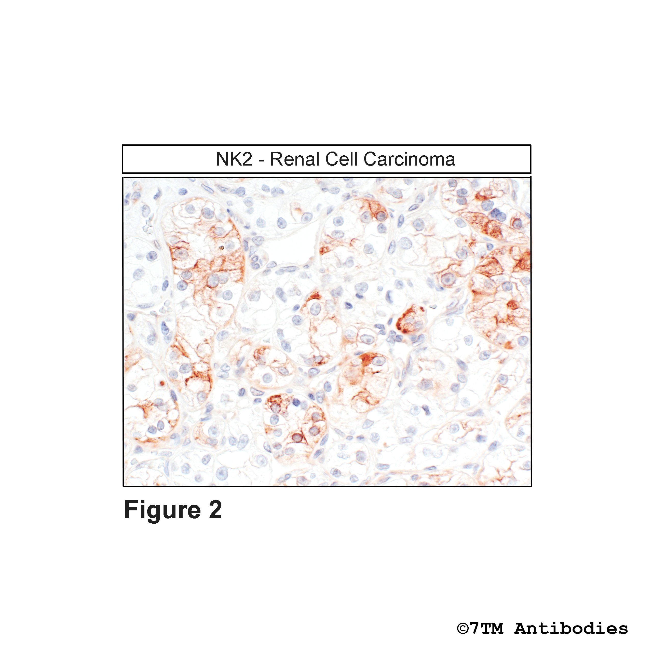 Figure 2. Immunohistochemical identification of Tachykinin Receptor 2 in renal cell carcinoma. Sections were dewaxed, microwaved in citric acid, and incubated with anti-NK2 (Tachykinin Receptor 2) antibody (7TM0361N) at a dilution of 1:100. Sections were then sequentially treated with biotinylated anti-rabbit IgG and avidin-biotin solution. Sections were then developed in 3,3-diaminobenzidine (DAB)-glucose oxidase and lightly counterstained with hematoxylin.